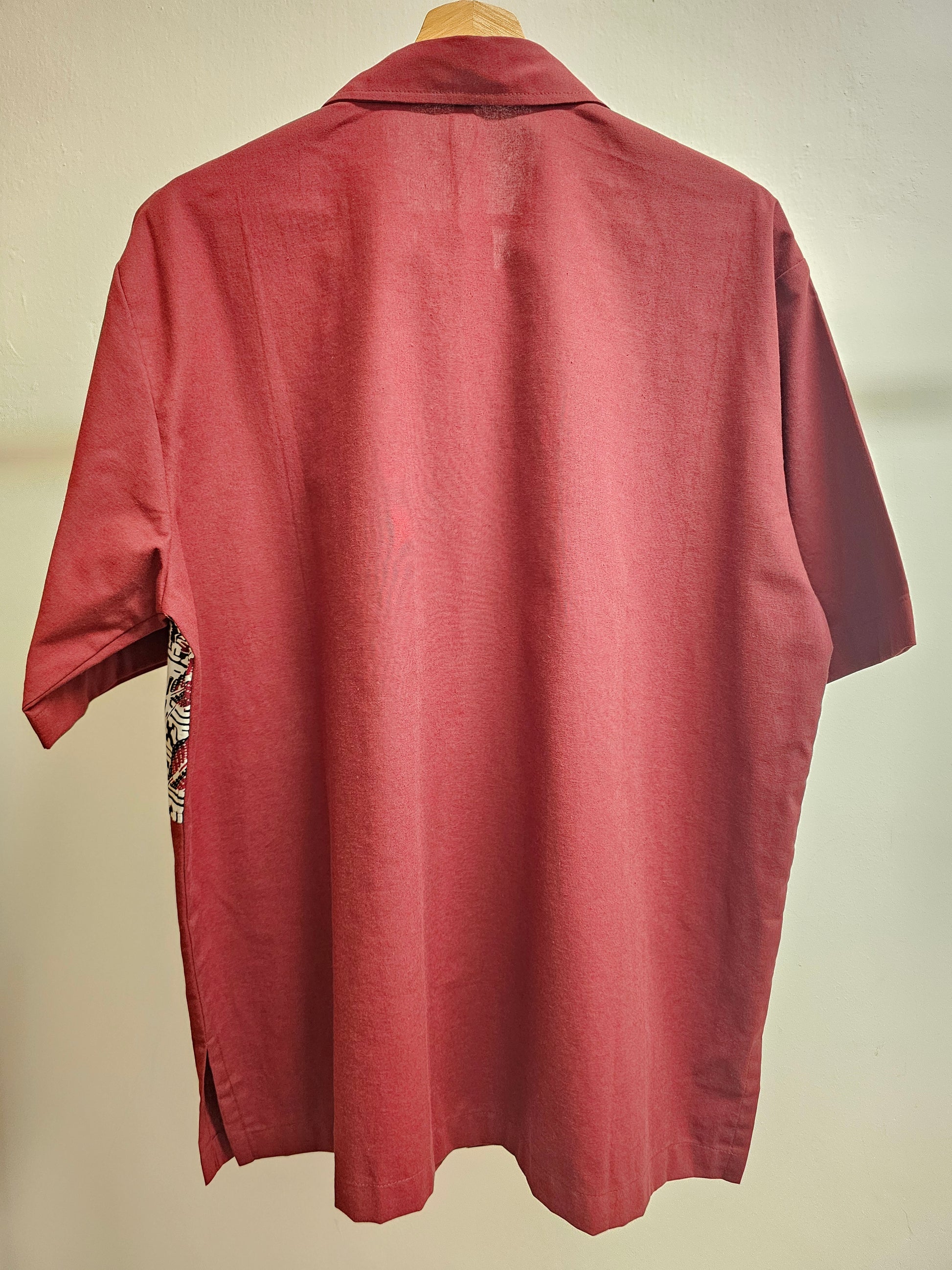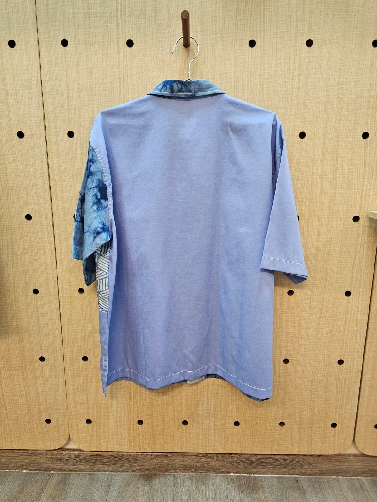 Camp collar shirt of indigofera batik and plain OekoTex cotton. With batik panel at the back and ikat (handwoven) collar.
