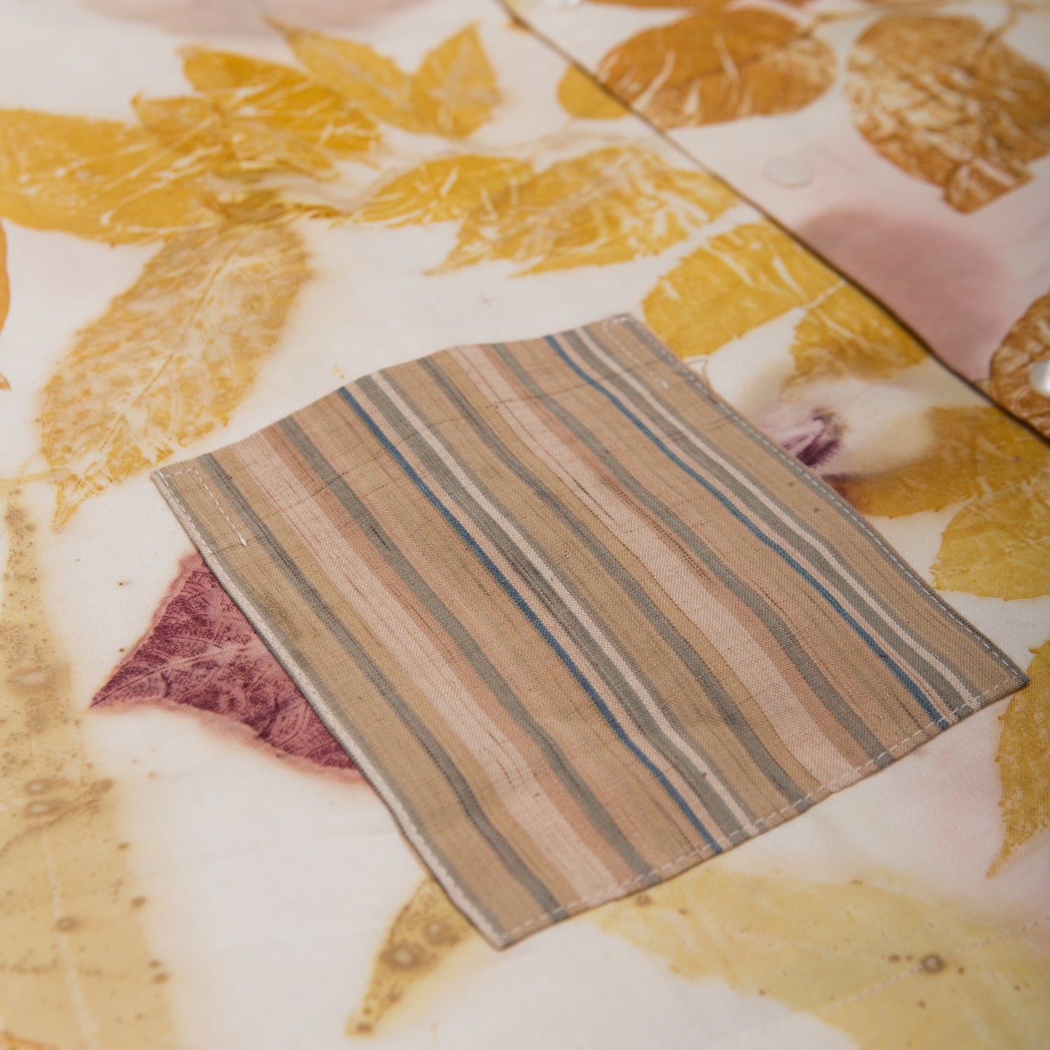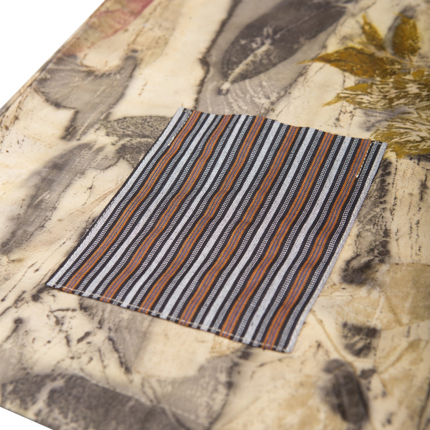 100% OekoTex cotton. Ecoprint is " an art form involving bundling leaves to create authentic leaf prints on fabric without addition of synthetic dyes. This technique resonates with the tradition of plant pressing commonly used in nature journaling.