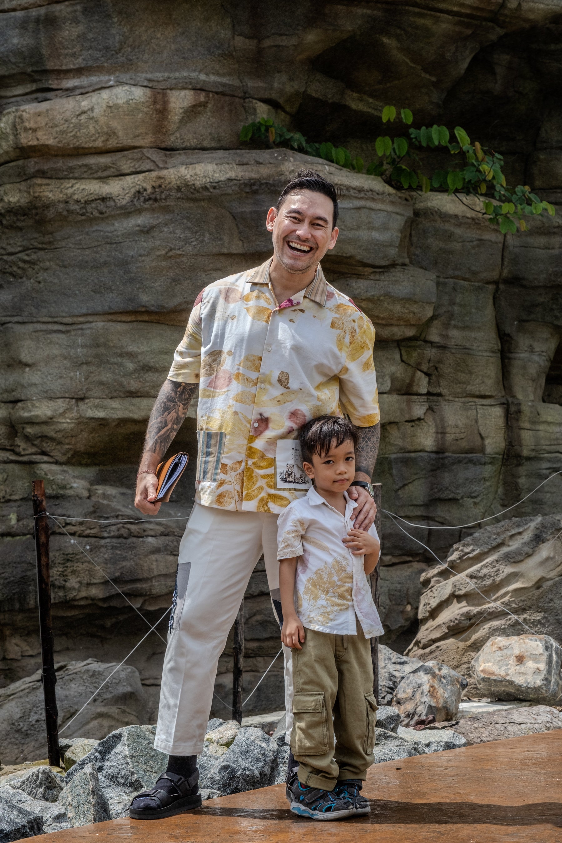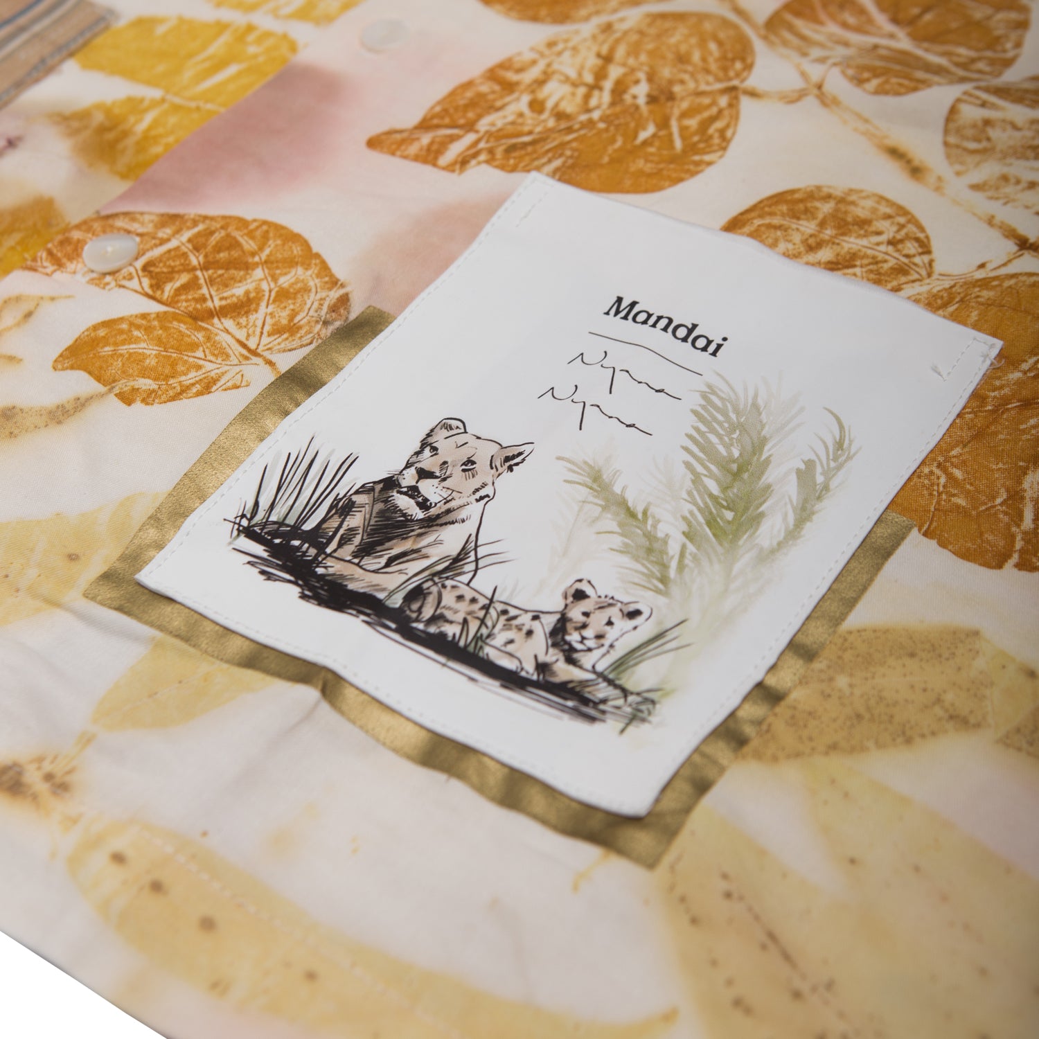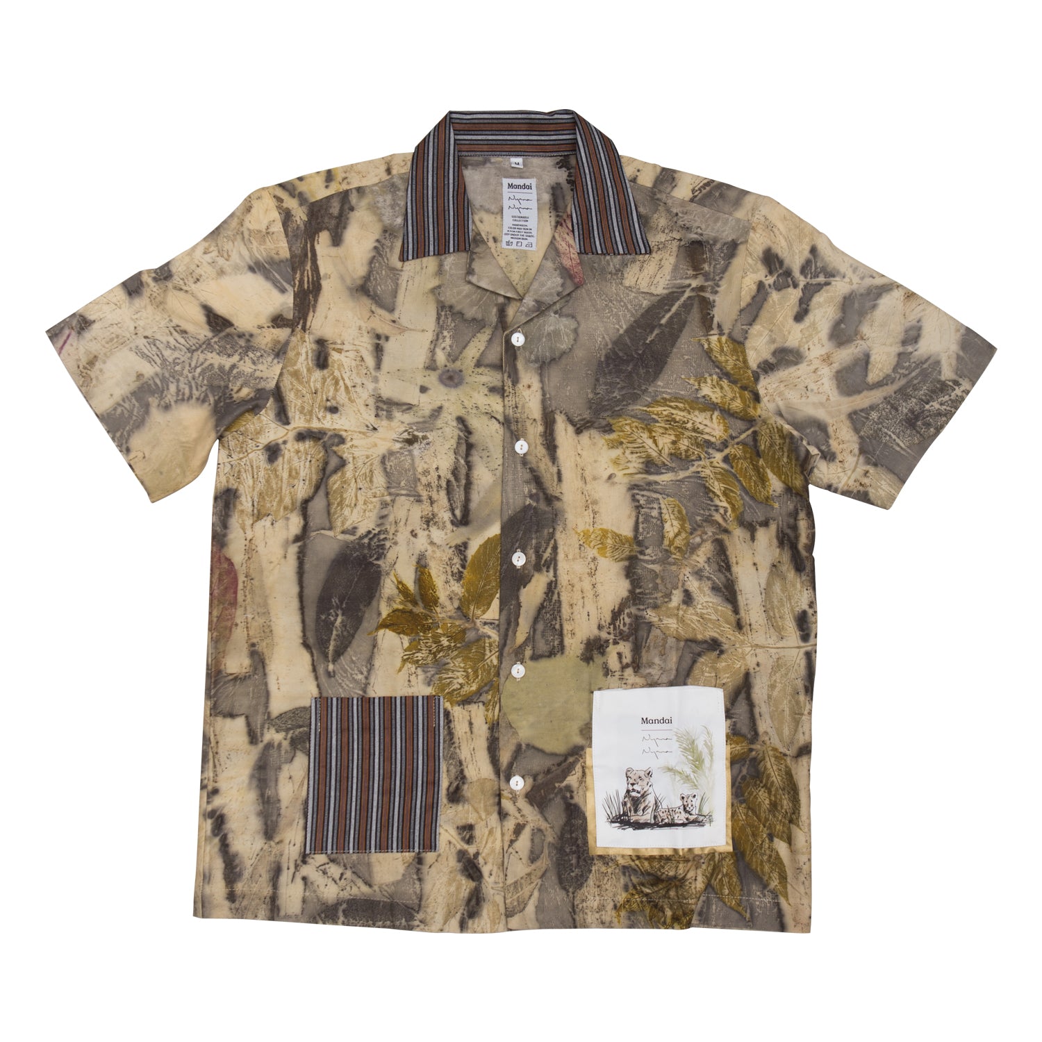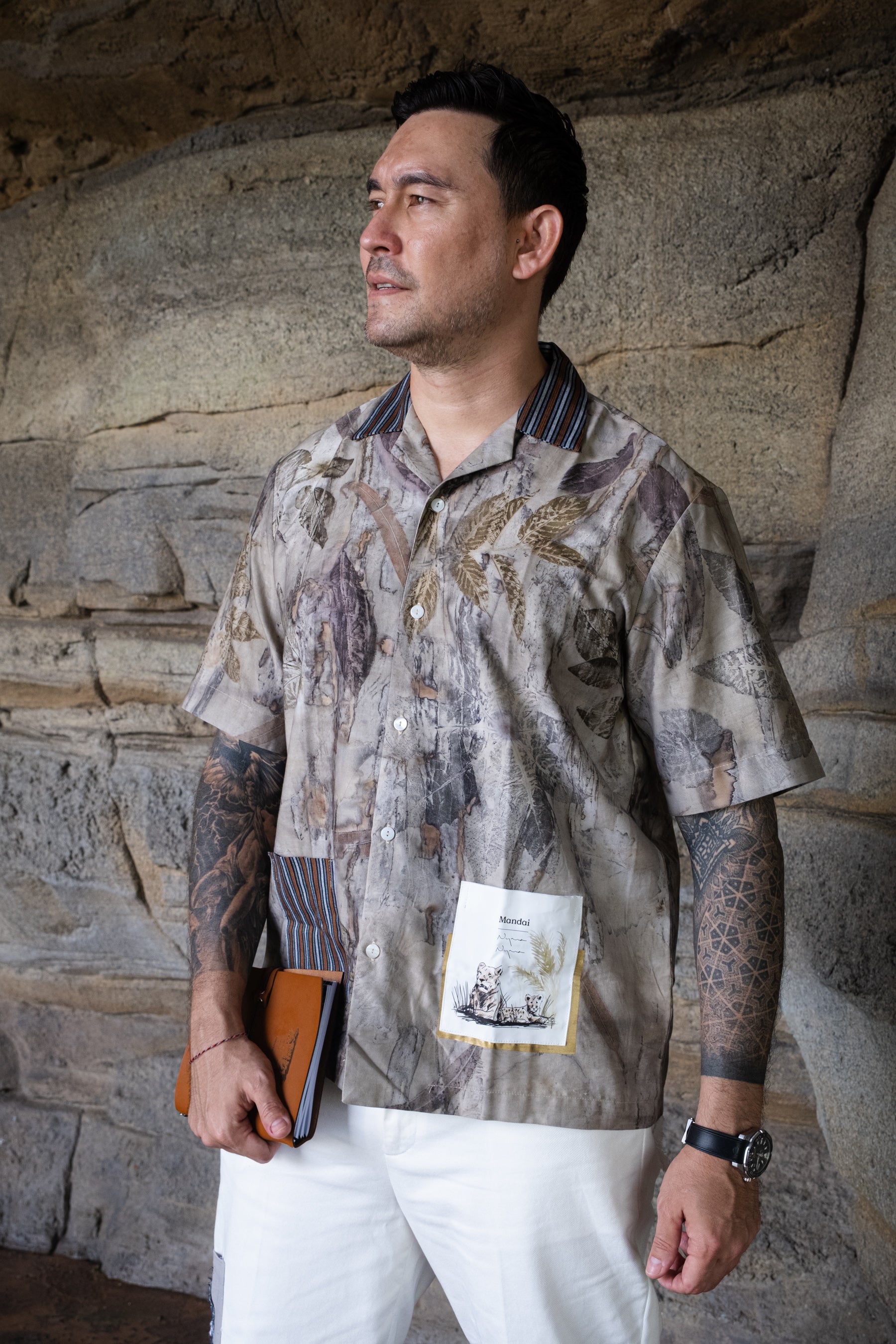 Camp Shirt, front buttons, 2 front pockets, contrast in collar and pocket using Handwoven tenun ikat and Hand Sketched Mandai animals. Relaxed fit.